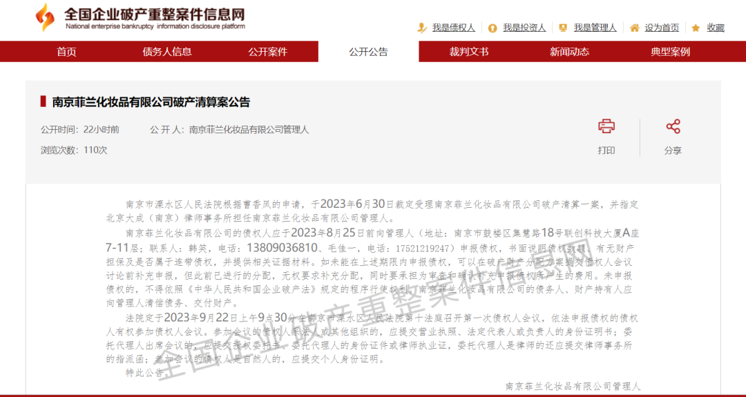 7月18日,全国企业破产重整案件信息网发布公告显示:南京市溧水区人民法院于6月30日裁定受理南京菲兰化妆品有限公司(下称“菲兰化妆品”)破产清算一案,将定于9月22日召开第一次债权人会议。